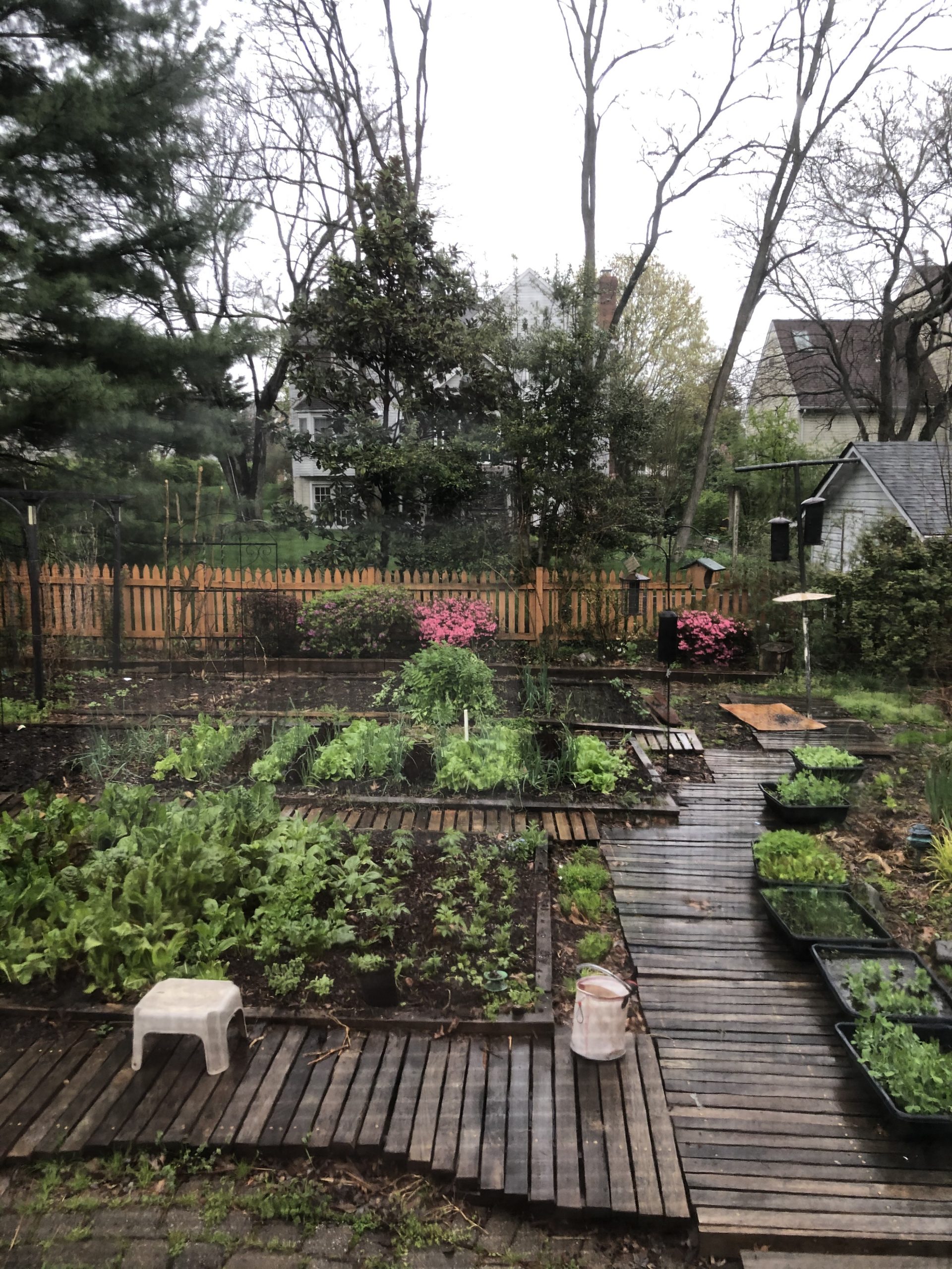 Dreary and gray today. Harvested a few greens from the garden this morning, in honor of National Gardening Day: kale, chard, and lettuce. I’m so grateful for a Hubby who loves growing things, even if I sometimes complain there is way too much and that 90% of our back yard is in vegetables and flowers, meaning there isn’t much of a place to sit apart from on the patio—which is next to the compost heap. Hubby’s goal is to wipe out the grass, although I wish he’d find an alternative to mulch and boardwalks. I should just stop complaining and be grateful his hobby isn’t fast cars and younger women.