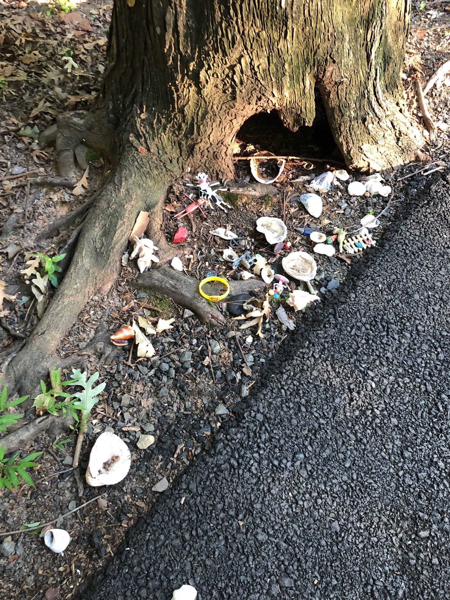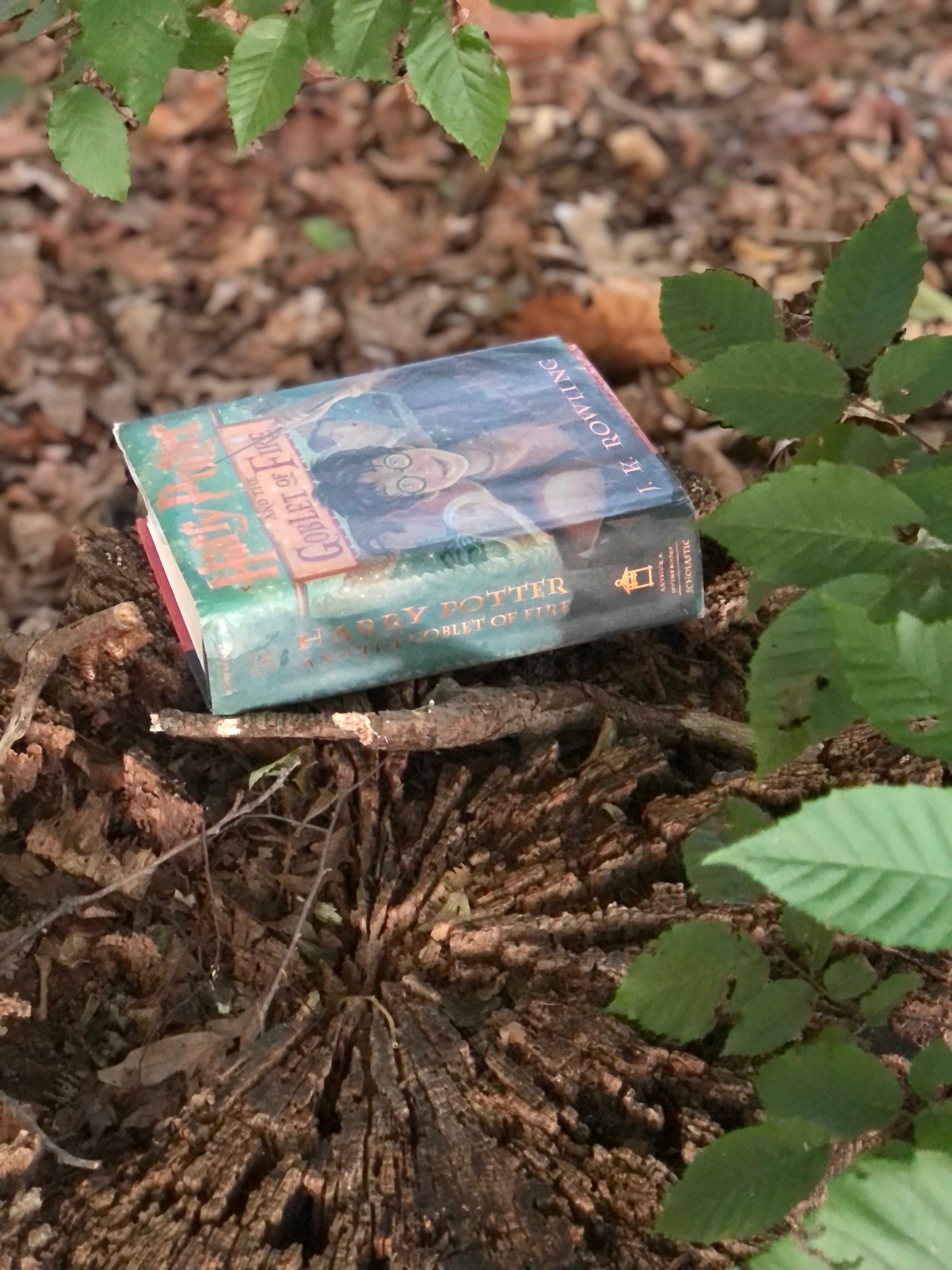 After supper I made some dark chocolate from scratch, something I haven’t done in a long time because I’m trying to kick the sugar habit (but I make my choc bitter). Then I headed out on my bike when the sun was going down to take advantage of exercising in the “cooler” temps (read: 89). I came across some unusual things in the trees near a townhouse development, where I like to ride around their little lake. Someone had set up what looked to be a fairy hideout, or maybe kids were just playing with some tiny toys. Nearby was a Harry Potter book lying on a tree stump. Next to it lay a stick that could have doubled as a magic wand.