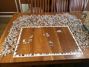 This evening we hung out at the puzzle table and listened to creepy radio plays. My current endeavor is a little more challenging than the previous puzzle, with all the white pieces. Hubby was reading about all the benefits of doing puzzles, so here’s to quality family time and mapping new and better neural pathways in the brain, and making me smarter and better able to think critically.